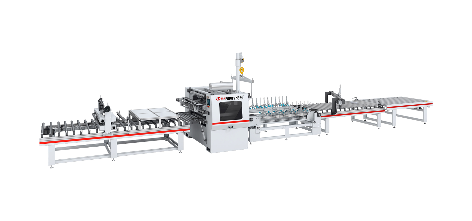 本生產(chǎn)線由:龍門上下料機(jī) — 對中輸送機(jī) — 粉塵清除機(jī) — PUR涂膠機(jī) — 恒溫隧道 — 平貼包覆機(jī) — 斜切機(jī) — 對中輸送機(jī) — 龍門上下料機(jī)等部分組成。